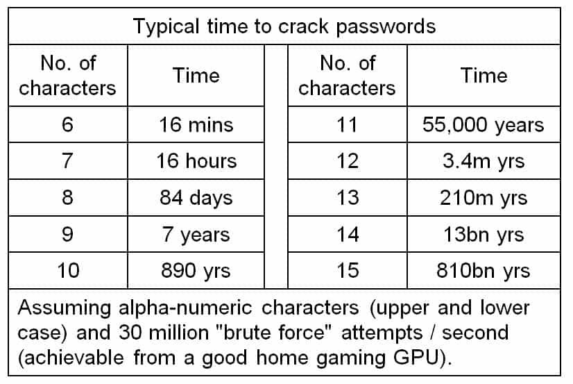 Many security hackers know that mothers often use the names of their children. Words can be memorable but do not use those in dictionaries. Generators exist such as at nexcess.net to create memorable, meaningless passwords. While some very powerful computers exist to crack passwords much faster than in the table shown, good websites have counter measures against “brute force” attacks. However, it is good practice if the password length is about 12 characters with at least one capital letter, number and a wild card symbol (eg, !$%&# etc). Add 2-factor authentication if available.
