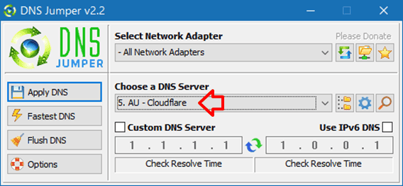 The section immediately above describes how ISPs work. Here we describe a solution to control your selection of DNS so that your ISP can’t see where you go. Its easy to install a utility from Sordum called DNS Jumper which is easy to use and provides control over which DNS people visit. In the picture immediately left, we recommend selecting the Cloudflare DNS. Click here for more information on Cloudflare. It’s useful that DNS changes using this app does not require a computer re-boot. Currently Sordum software is Windows only. Presumably there is something similar for Mac and Linux users.