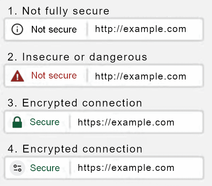 HTTP is not secure. HTTPS is secure meaning that other parties cannot see, eavesdrop or tamper with the website content that people are browsing. The address in the top bar may or may not be preceded with https:// or https://. And it may not say “secure”. So keep with #3 and #4 (lock and icons) if you have passwords, banking or payments involved. Functionally there is no difference between #3 and #4, other than the icon, which Google Chrome introduced in Sept 2023.